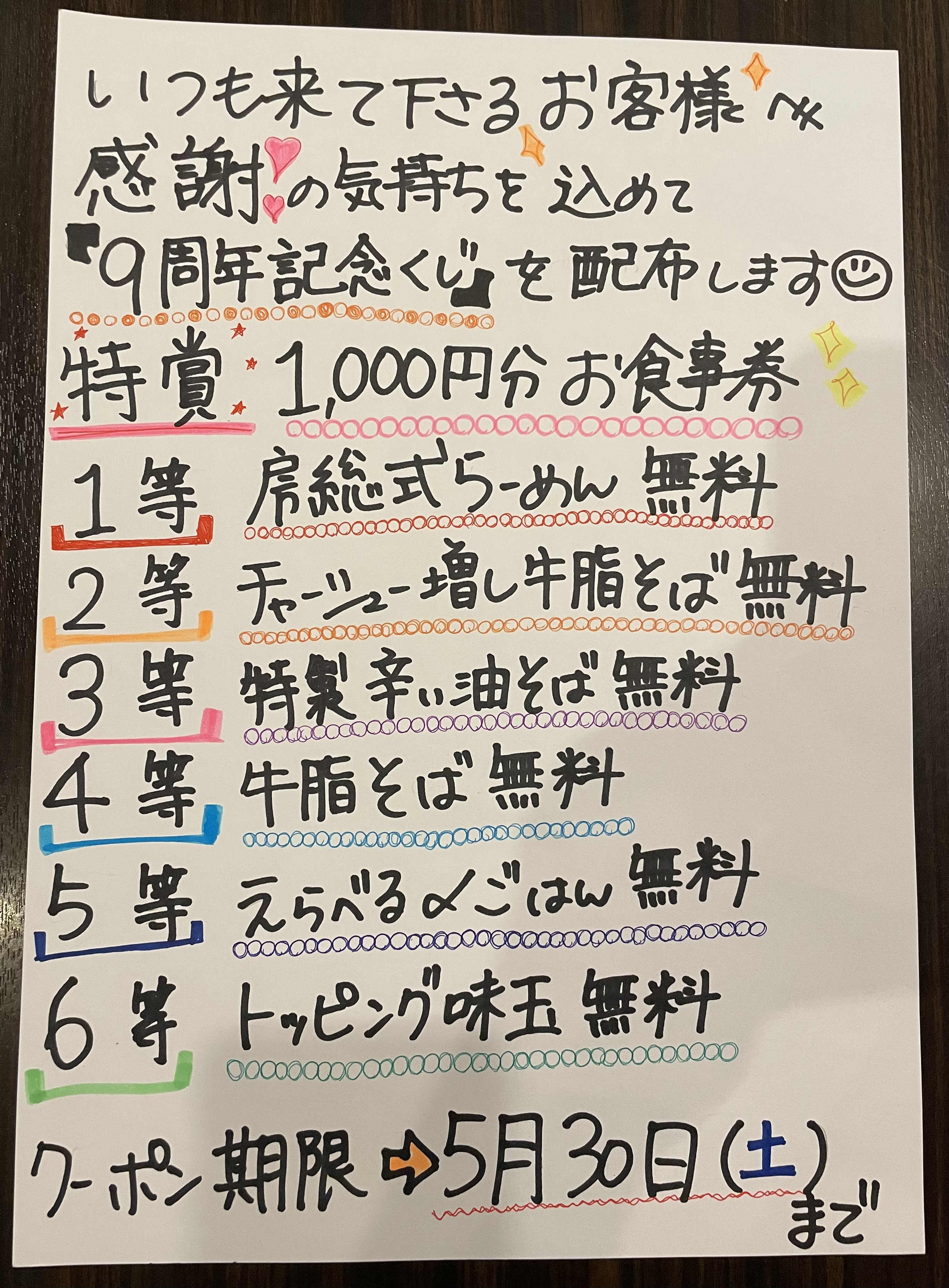 ラーメン一杯につき1枚引いて頂き、当選順位通り次回以降クーポン券として交換して頂けますと幸いです