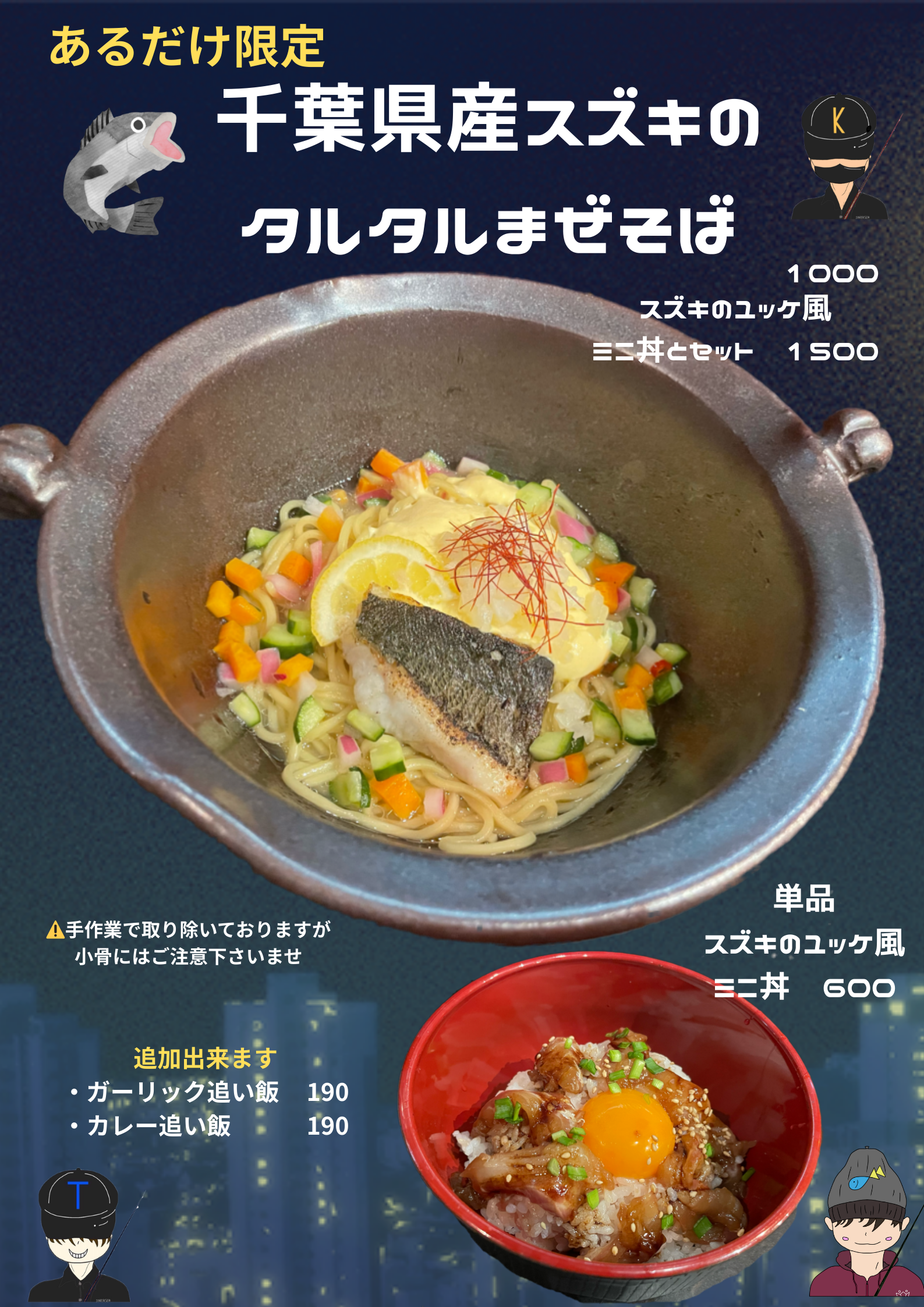 千葉県産スズキのタルタルまぜそばとユッケ風ミニ丼のご紹介です